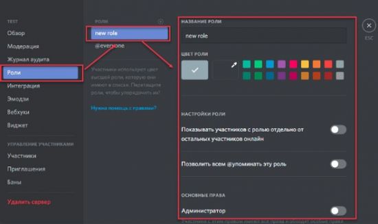 4. В параметрах роли укажите название и (самое главное!) выберите цвет из предложенной палитры. В него-то и будет впоследствии окрашен никнейм.
