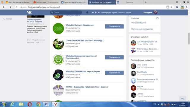 Чтобы найти сообщества, нужно зайти в Группы в социальной сети, например, Вконтакте, и ввести в строке поиска «Знакомства WhatsApp». Появится множество предложений. Не ко всем, однако, группам следует присоединяться.